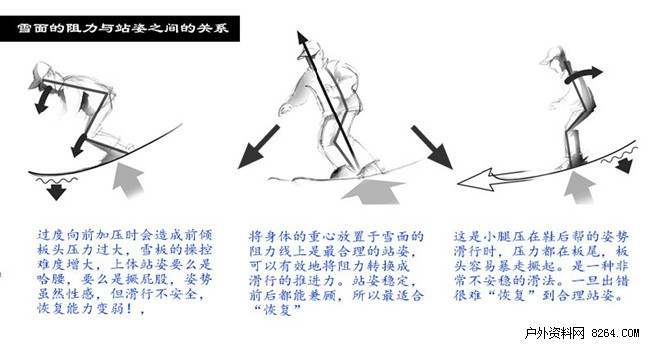 “恢复”用于防患滑行中的“不测”,所以,来练习如何“恢复”比较困难。但是滑行中,我们可以尽最大程度保持合理的站姿来提高我们的“恢复”能力。那么如何来保持合理的站姿呢?首先,回转过程中,面对雪面的阻力我们要敏感地感知到,然后把重心向能够将此阻力和谐的位置去移动。这样的重心移动也就是站姿的高低,左右,前后的变化。而站姿的变化又是通过脚踝,膝部,以及髋部这三个部位的关节弯曲来实现的。(站姿可以分为,高,中间,低,以及蹲姿)最适合做“恢复”的站姿为“中间站姿”,无论是用刃过程中,还是在转换带之中,都需要保持这个“中间站姿”。当然根据弯的弧度,以及滑行的速度差异,采用中间站姿的动作幅度也会不同。虽然在大脑里意识到中间站姿,但是实际动作上,脚仍然蹬出,而且蹬的很直,大腿部与坡面不仅仅形成平行状,而且还会压的更低,这样的极端的站姿是不利于“恢复”的,所以要尽量规避。我们目前使用的雪板大部分都是carvingskis,即卡宾板,腰线都很深,典型的小回转板例如66,67等,所以更要注意前后的重心平衡。如何合理保持重心的前后平衡呢?那就要学会如何使用你的前脚掌和后脚掌,脚对雪板加压的过程是由脚掌为先,然后过渡到脚跟的,换句话说,加压点也是一个动态变化的过程。同时压力点的范围也仅限于从你脚的大拇指到脚后跟这个范围。如果你加压点超过了大拇指,或者落后于脚后跟,必然发生重心过前,或者过后的现象,也自然容易引发错误的动作。出现这样的情况时,“恢复”也变得难了。我们在初学滑雪时,一些教练会反复要求我们顶鞋前帮,这是一个矫枉过正的训练方法,如果一直过分的压前鞋帮,也是不对的。此外,懂的顶鞋前帮之前,一般都是小腿肚子压鞋后帮。如果滑了一天的雪,你发现要么你的小腿前侧特别疼,要么小腿肚子很疼,这都说明的你滑行时前后的平衡没有处理好!